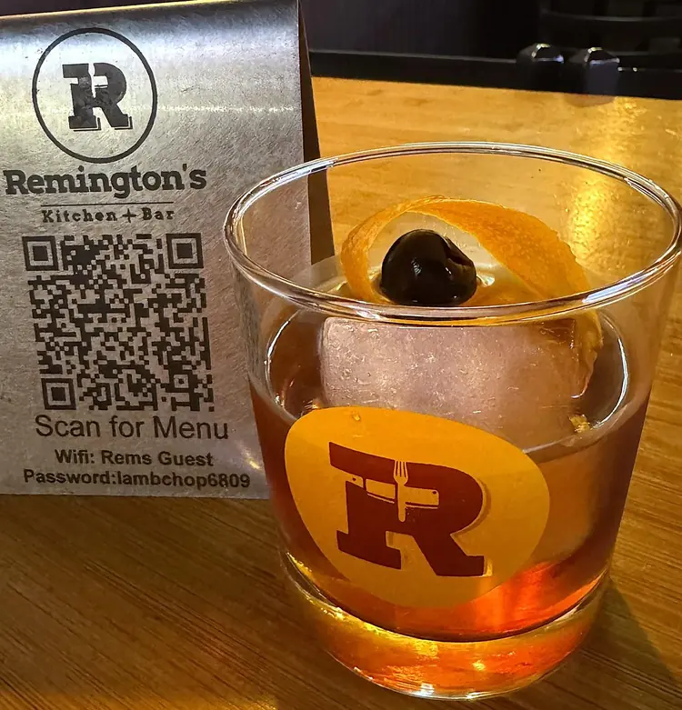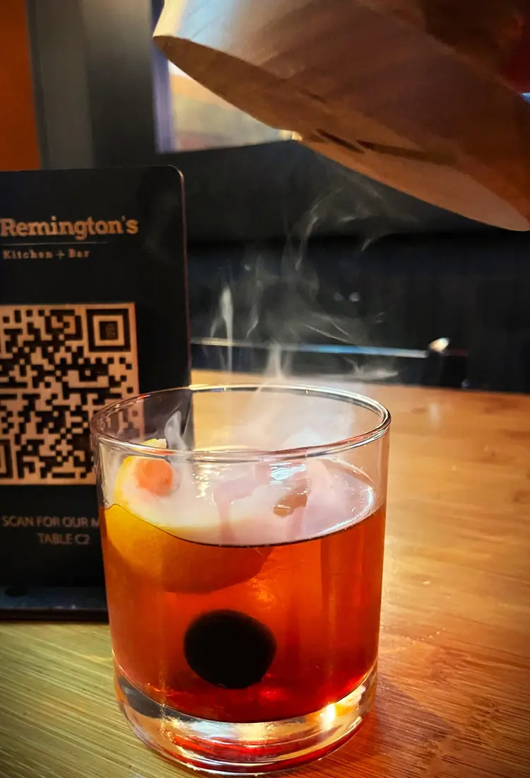 BuffaloTrace Bourbon, angostura bitters, sugar, orange peel and a brandied cherry, smoked with cherry wood for enhancing the overall aroma.