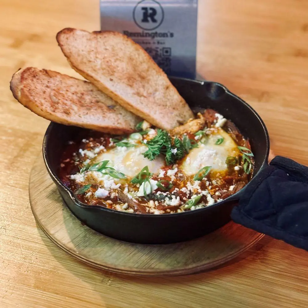 This Turkish Breakfast Staple Called "Melemen" Starts With Tomatoes, Peppers & Onions Simmered With A Special Blend Of Spices Then Topped With Two Poached Eggs & Feta Cheese. Served with Toasted bread.