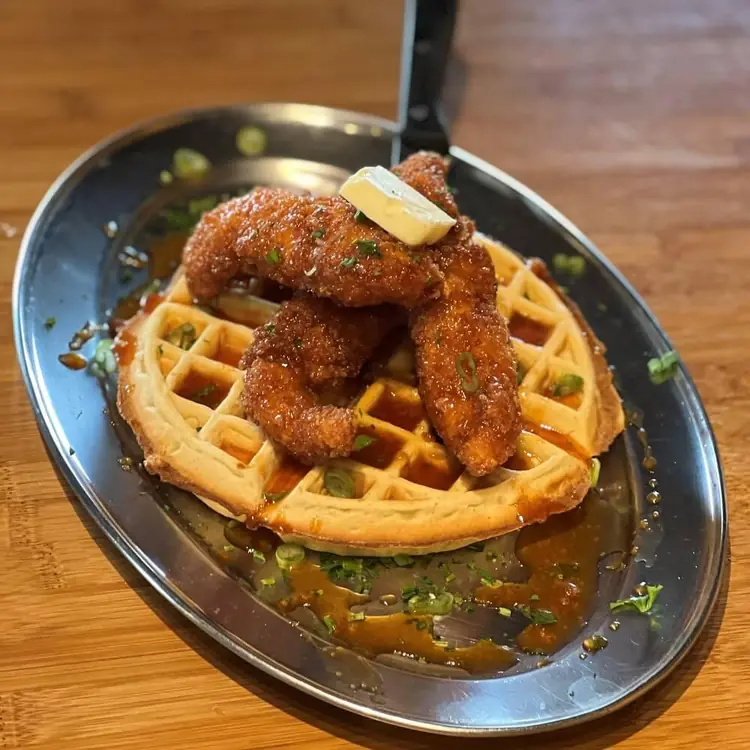 Large Belgian style waffle topped with three hand breaded chicken tenders tossed in our hot honey, served with butter & maple syrup.