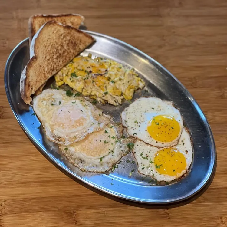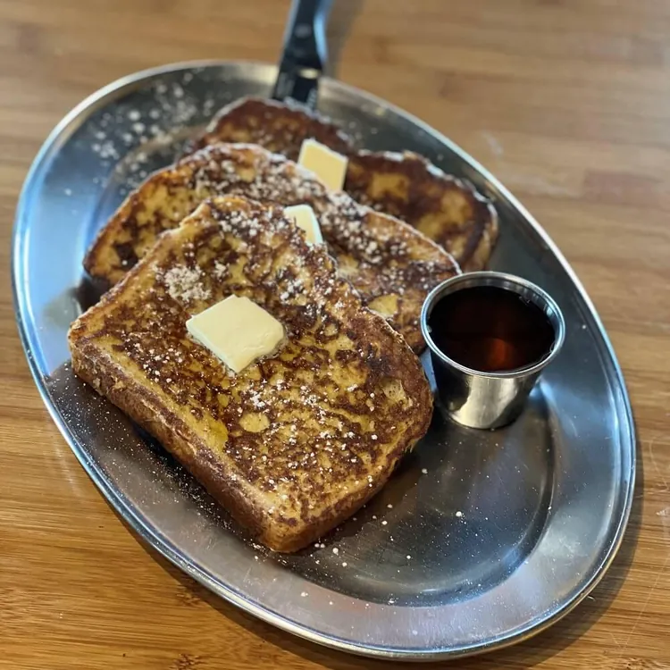 3 Slices of challah bread french toast topped with powdered sugar & maple syrup.
