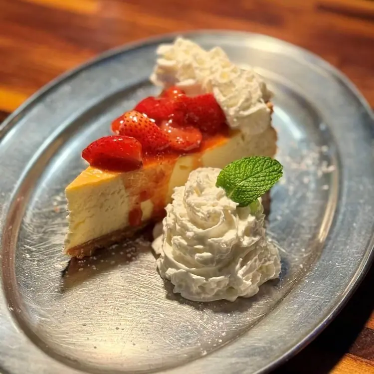 A Large Slice of In-House Baked Cheesecake Topped With Scratch Made Strawberry Compote & Whipped Cream For An Indulgent Experience.