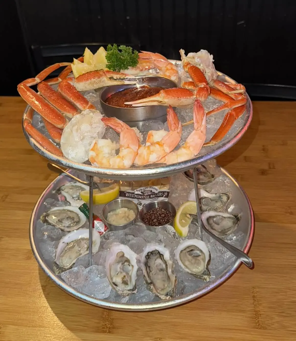 A dozen oysters, six U-12 cocktail shrimp & two snow crab clusters. Served with cocktail sauce , horse radish & mignonette.