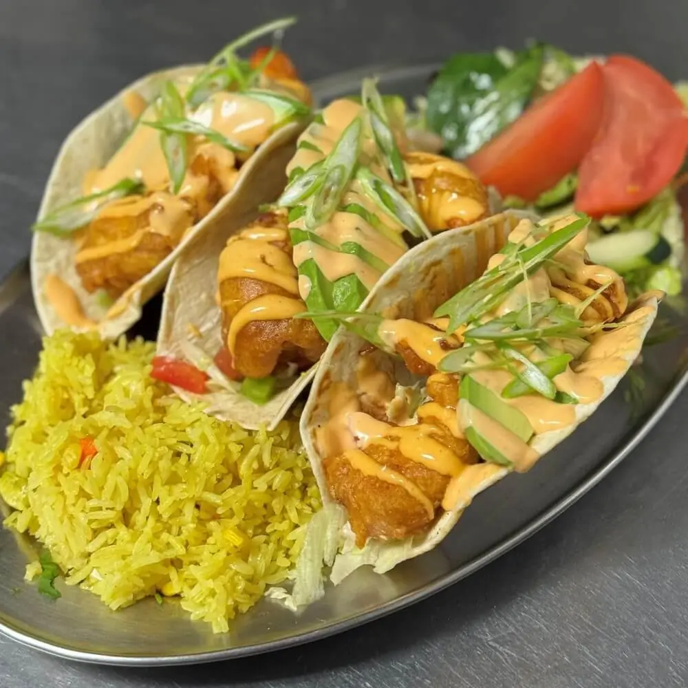 Jumbo Shrimp lightly tossed in Cajun breading, then flash fried to perfection. served over a flour tortilla with shredded lettuce, pico de gallo then topped with sweet n spicy sriracha aioli & avocado slices. Served with Spanish rice and salad.